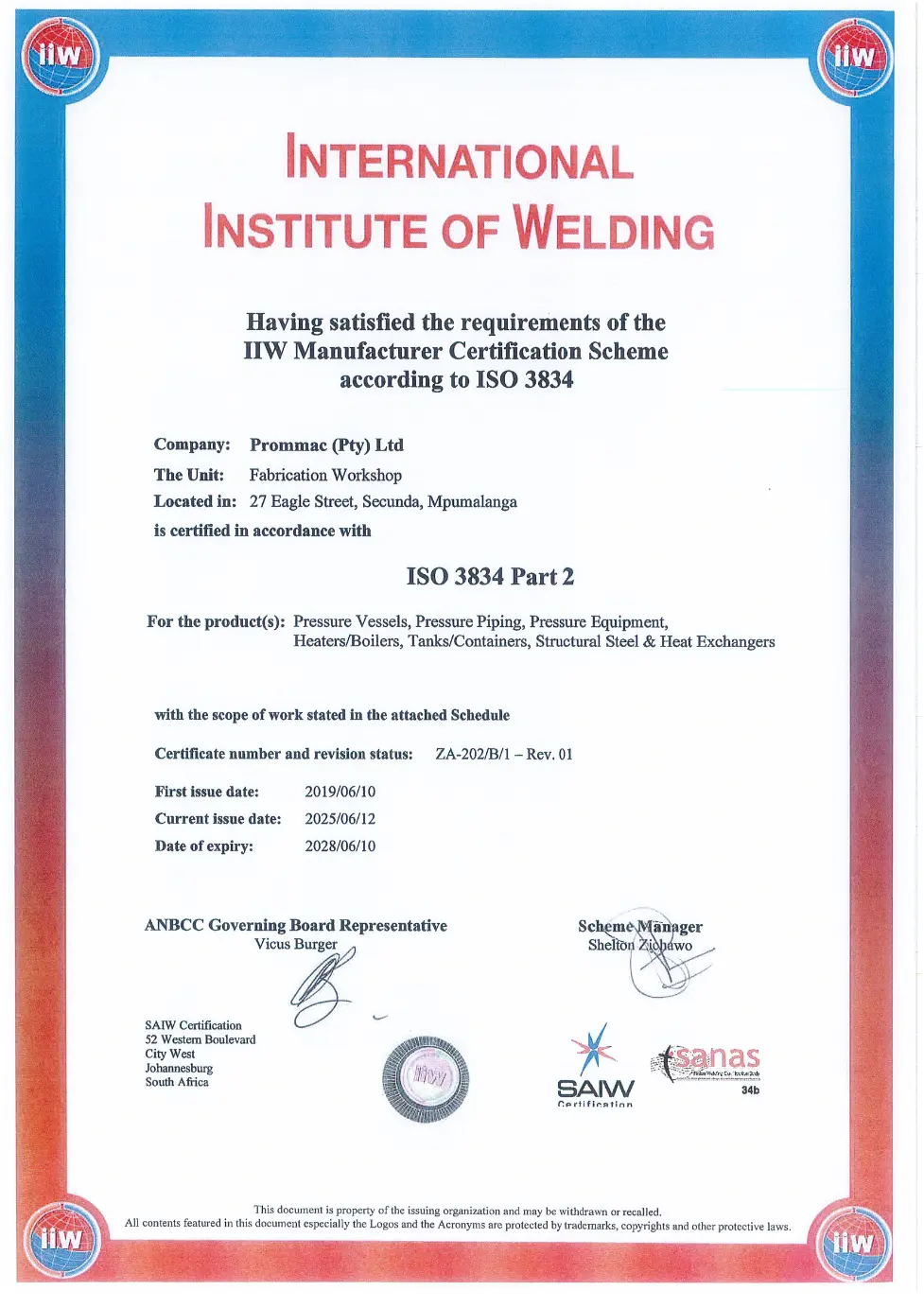 Ensure quality and peace of mind with Prommac's comprehensive industrial services. We're a trusted partner for businesses requiring accredited solutions. Our BBBEE rating, ISOQAR registration, NOSA 5-star grading, and ISO 3834 certification guarantee our commitment to quality, safety, and ethical practices.
